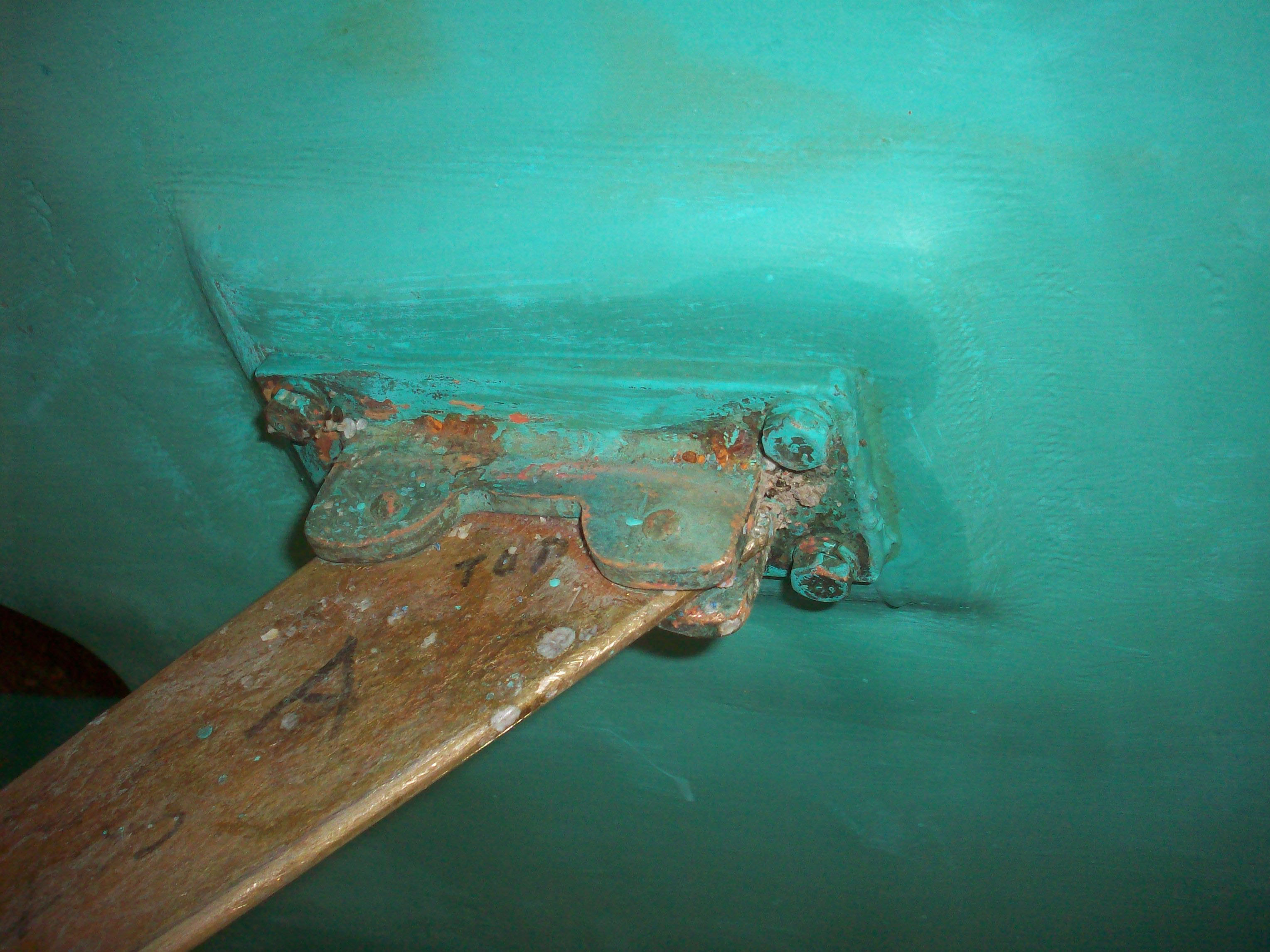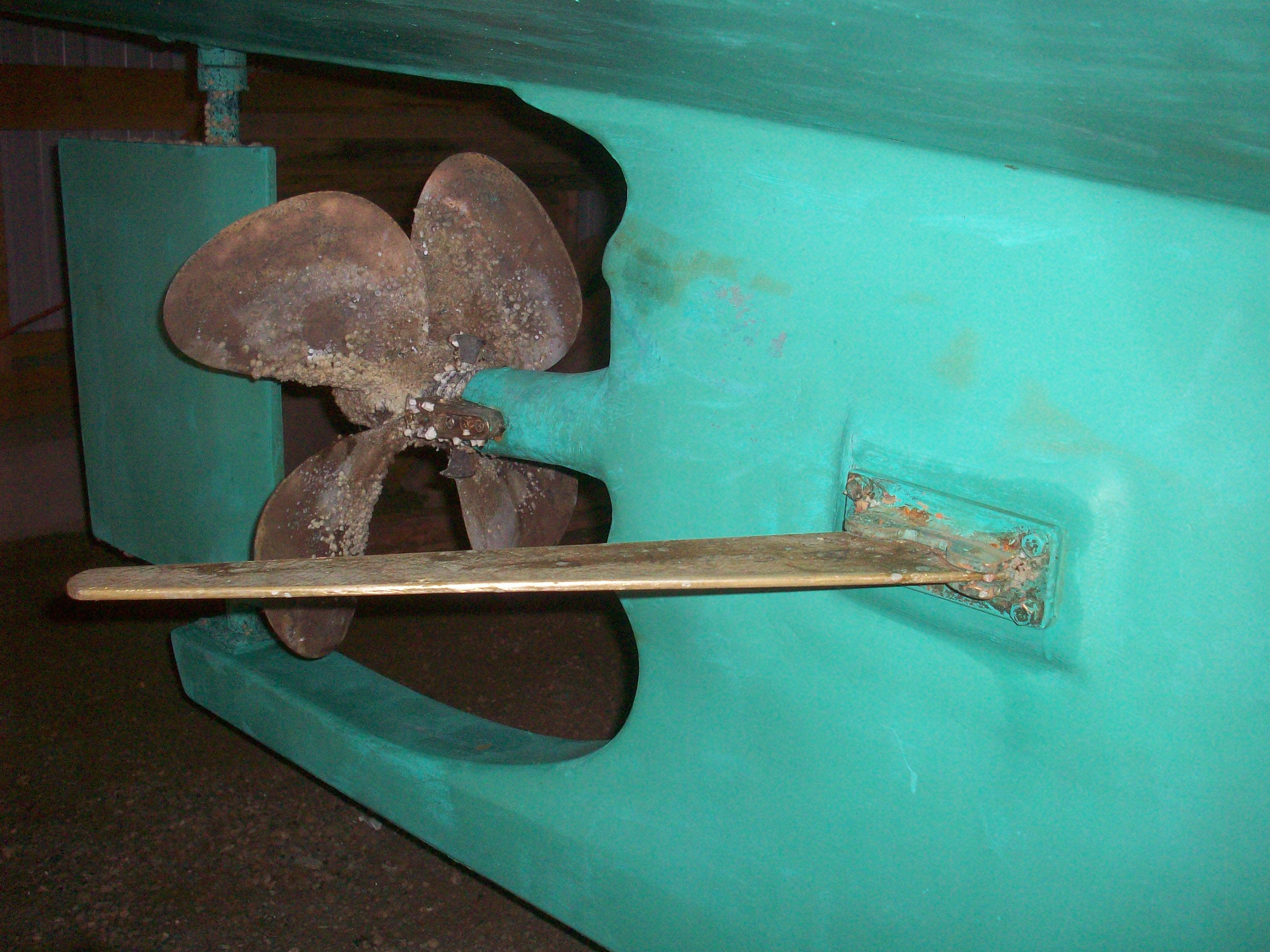 A couple of times on past shows Giffy Full has mentioned his “pot deflectors” as a friendlier way of minimizing getting lobster trap rope wound-up in your propeller. Friendlier than cutters, one trap costs about $50. So a picture is worth a thousand dollars. Here’s 2K. The forward pin is smaller than the aft pin in the bracket, so if it takes a hard whack it should swing back. The fasteners are copper rivets.