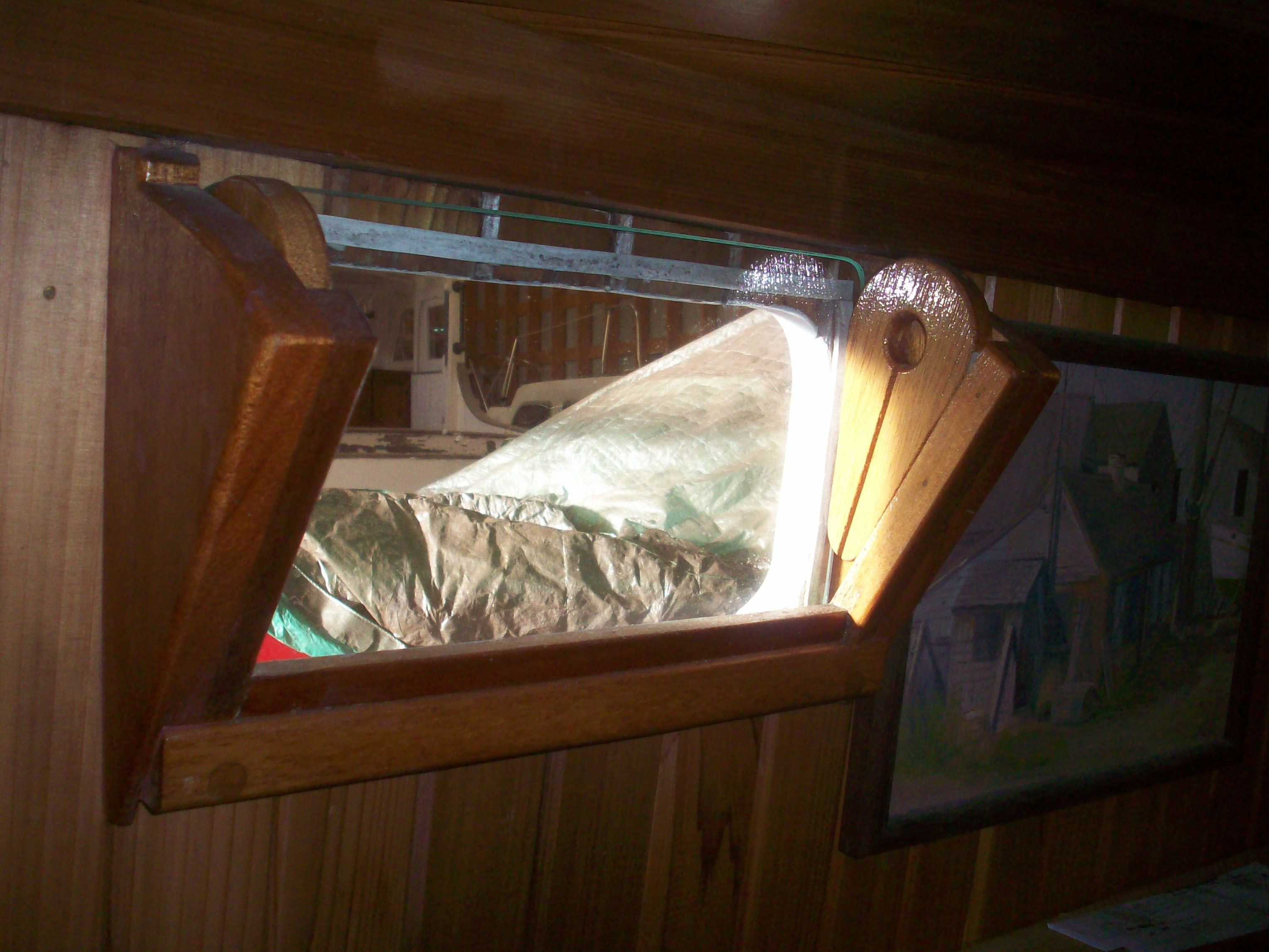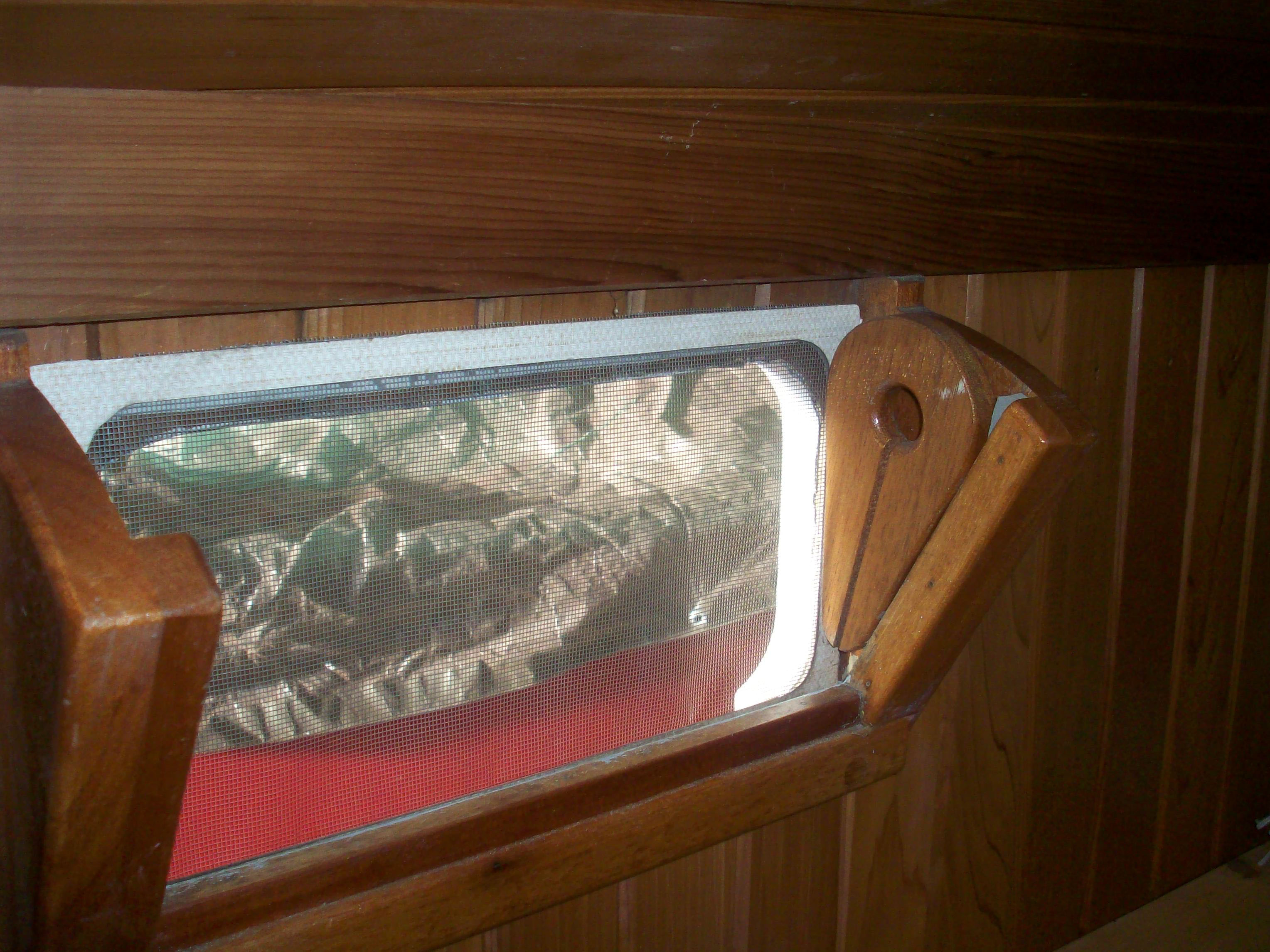 While I was at the boat he told me I should see his portlights also. He calls them the “Winthrop Warner” portlights. Pretty simple. Just change the glass for a screen made of screening laminated into a formica frame for ventilation. No great panes here. a.s.